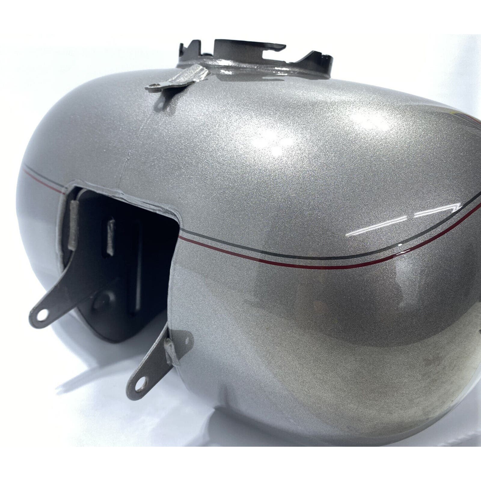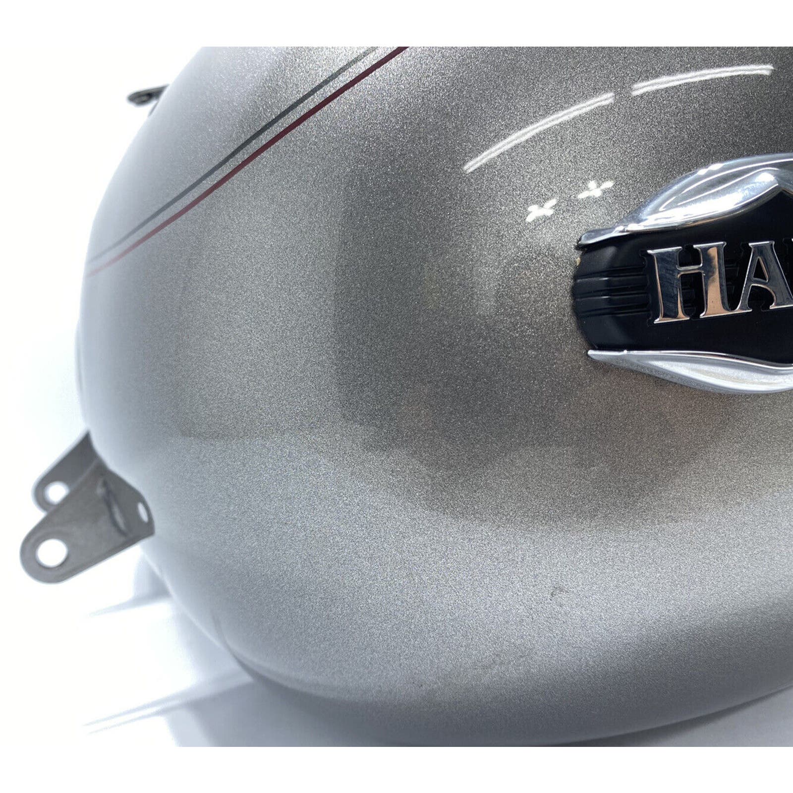 This tank is in good condition. No dents or major scratches. There are few small dings on the front of the tank and some minor wear marks. It is billet silver, dark red and dark gray pin stripping.